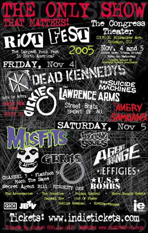 The final lineup has been confirmed for the two day Riot Fest 2005. As previously reported, the festival will be headlined by Dead Kennedys on Nov 4 and The Misfits on Nov 5, with appearances by Agent Orange, The Dickies, Angry Samoans, Lawrence Arms, Suicide Machines, The Germs, The Bouncing Souls, U.S. Bombs, The Effigies and many more.