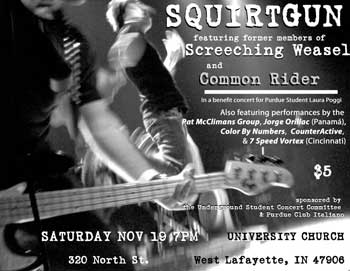 Squirtgun will be playing its first US show in two years Saturday November 19th at University Church in West Lafayette, Indiana. Of note is the appearance of drummer Dan Lumley (Screeching Weasel, Common Rider, Riverdales), who has otherwise retired from music.