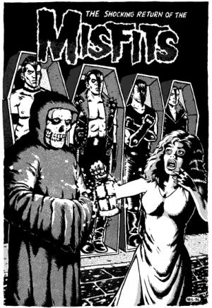 Jerry: No, I think it's everything. It's basically a mixture of "Earth A.D." and "Walk Among Us", but with, I think, a lot more flair in the song writing and the arranging of stuff. Our tour ended in September and at that point we knew we were gonna deal with Geffen so Michael Elargo, he's their A 'n' R guy, he signed Metallica and White Zombie and bands like that to different labels, so what happened was that he had a very good feel for the kind of material that would fit our image, uh he used to book us at The Ritz in 1981, so he knows who we are. He booked that show that's on our live album. Daniel Ray was the producer, and every Thursday sat down, we got a big conference table in our machine shop where they produce our products and shit, but we would sit there every week and go over every song, and every line of lyrics and every new idea, and six people would vote on it, so on our new album, I like 95% and Chud likes 95% and Mike likes 95%, but it's all a different 95%, and that was the whole key. This new album has 18 tracks on it and you can listen to it from the beginning to the end, and you don't ever look to fast forward or rewind or whatever. You're very happy to hear the next song. The thing flows from beginning to end, and that's the most important thing about our new song writing. I think it's incredible. I think that our new album is our best album to date and the funny thing is it's the one that's gonna get pushed by Geffen instead of Caroline who sit on their thumbs all day. I think we made the right move and they're very respectful to us, so the situation is that I get a little bit jumpy when they do something wrong over there, and I jump down everybody's throat so I'm trying to refrain myself. I'm more the enemy to myself than them being the enemy. They're more my friend than I am to myself, so I have to learn to be respectful on the other side too. Y'know in this world, not matter what you do or who you are, it's a give and take thing. If you're respectful to people you usually get it back. I think The Misfits are the band of the next century. I think that not only did we leave our mark on this century that just passed us, uh really the future of metal was based upon things that we did. There were bands that we picked it up from, for example Bowie, Kiss and Queen and stuff like that, and those bands, they'll always be around and you'll always hear them, but I think that the eighties was shaped by what we had done and by our influence, and now in turn it's kinda funny because we had to come back and pick up the pieces because the eighties imploded. looking back in retrospect, the eighties was a big waste of fuckin' time. We are back to the seventies because everybody eventually figured out "Oh, the eighties sucked" you know what I mean? The music that came out of the eighties was a bunch of shit. Most of the bands in the eighties you won't hear about in twenty years. You'll still hear 'Bohemian Rhapsody' and you'll still hear Kiss or whatever, but I think that The Misfits, with the new song writing team that we've got and the new energy that we've got, we're gonna have songs that are gonna make it to very big places and we wanna write songs that are great and we don't wanna write songs because punk is in and we don't wanna write songs because thrash is in. We're gonna write you a good song. What it is or where it goes is not our concern, but we're gonna write some really good songs for ya. Some of them maybe slow and some of them maybe fast, but that doesn't matter. A good song is a good song. You'll never hear a shitty song by us.