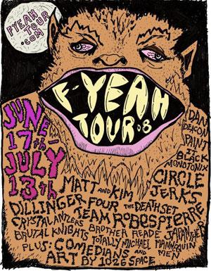 We've got three sets of two tickets to give away for dates on the 2008 edition of the F*ck Yeah Tour. The shows take place in Philadelphia, PA, New York City and Brooklyn, NY. Since the prizes don't include a plane, you'll need to find a way to get there but when you do, you'll be treated to highly anticipated sets from the Circle Jerks, Dillinger Four, Matt & Kim and more. Philadelphia includes Paint It Black, New York City and Brooklyn include Team Robespierre.