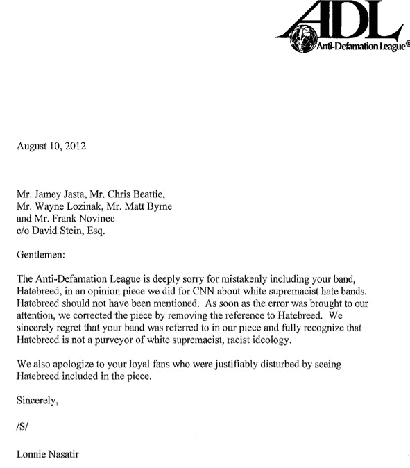 Magnanimously, the letter recognizes that Hatebreed is not in fact a "purveyor of white supremacist, racist ideology." The band responded with more politeness than one would expect from guys who recorded a song called "Destroy Everything" saying simply: "Thank you Lonnie & ADL for the letter of apology to us & our fans."