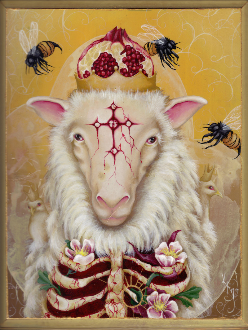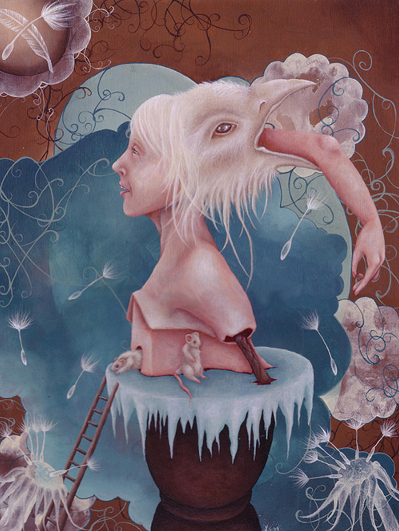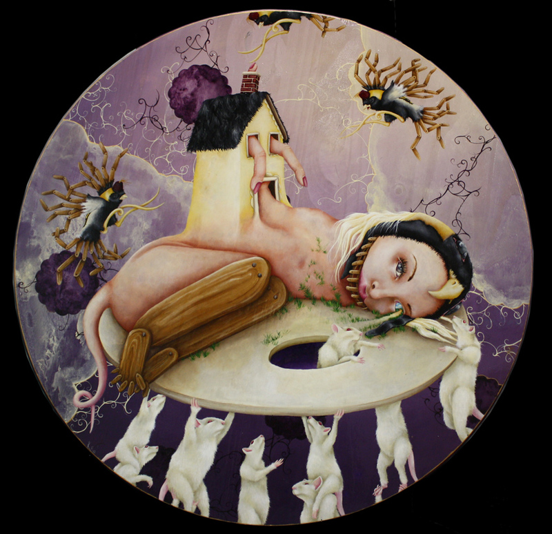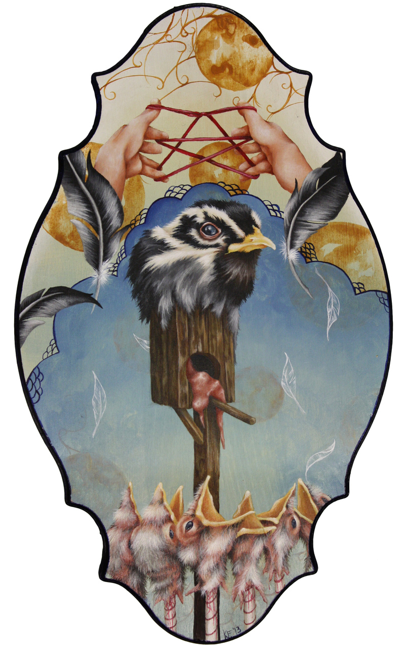 The things that I chose in my paintings (like the body parts and such) come from my obsession with classical and religious symbolism. In the master's works, every object in their paintings had a very specific meaning, and when you put the whole painting together it told a story, like a beautiful secret code. So I take those old symbols and "rework" them. For example- a swan meant devotion. If I show a severed swan's head attached to the top of a birdcage, it relays the message of being trapped in a bad relationship/situation that it has dedicated itself to. If I put keys in this severed swan's mouth - keys symbolize freedom - it means it has had the option to leave but doesn't because of its unfortunate circumstance of having had its head cut off. If you know what the old symbols mean, you know the story.