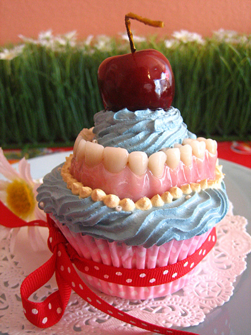 Those little cupcakes are so much fun to make! I had a little mini-series of tiny paintings of "unappetizing treats," and cupcakes with severed fingers in them were in the series. A friend taught me how to make super realistic looking "fake pastries" with clay and spackling, and I decided to make plaster molds of me and my son's fingers to put in them, mainly for our own amusement. I have another dreamy friend who is a mortician and she started sending me bags of dentures from her funeral home that they just would have thrown away. I decided those needed to be fake cupcake toppers as well. I didn't expect for them to be of interest to anyone one- but whenever I make them they sell like crazy…. which makes me giggle tons!