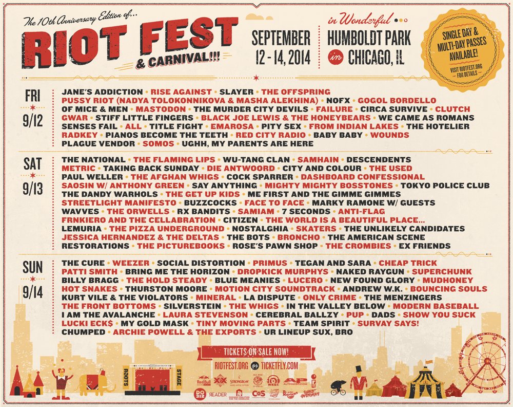 Riot Fest has announced 1-day pass sales along with the daily line-ups for the Chicago version of the annual romp, September 12-14 in Humboldt Park in Chicago. This year's line-up features The Cure, The National, Samhain, Social Distortion, Descendents, Buzzcocks, Pussy Riot, The Offspring, Wu-Tang Clan, Restorations and many more. Tickets are available here.