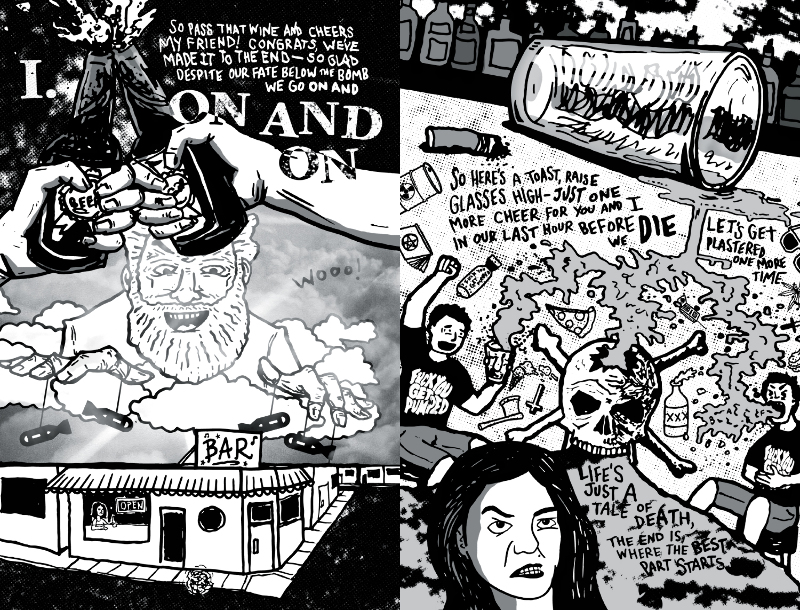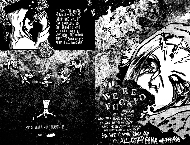 How did the idea for a comic come about? Nick Woods: I sorta thought up the idea when we were out east in 2012 on one of our first few short tours. The idea for a concept album came up first. Then the movie thing came up. And then it was "Well, what if we do the movie without a soundtrack or dialogue, and you have to follow a book to know what's happening? Like an opera playbill or something?" That idea proved pretty stupid, and we ended up basically just making a half-hour long music video, but the comic book idea stuck around because I was reading a lot of those at the time. I really had no idea how much work it would be or anything though. So Eric kind of had to come up with the idea for how it would look and feel, and how we could print it and stuff -- He can talk about that better than I. I don't really think it's a comic book straight up… It's more like a cross between a comic book and a zine and a lyric book. Or something. I dunno, I think it's a really unique piece of that box set. Definitely really excited about how it came out.