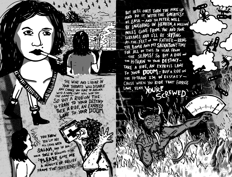 Eric: I don’t ever remember saying that having a girl chop a dude up into bits was something we could achieve! Dylan Brown (director of the videos) gets all the credit for figuring out that pool noodles look like legs when you put ‘em in pants. That’s a great example of what I was talking about. Originally I wanted to be all artsy and use symbolism for that part, like having her grilling some super-bloody steaks in the backyard or something, and then use the book to showcase what’s really happening with some graphic, gory illustrations of her chopping up her husband. Once we mastered those bargain-basement special effects, though, it was clear that the book no longer needed to work too hard for that part of the story. The video does the job. I keep thinking about the insert for Dookie that I looked at thousands of times as a kid. Contrasting with the chaotic, dense cover art, just a few simple illustrations next to the lyrics set the tone for the entire album. It’s perfect. I think there’s probably a little bit of Dookie in everything I do. Sorry.