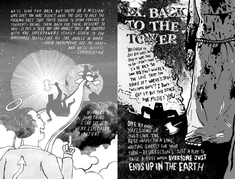 Eric: Yeah, we tried to make the book and videos complement each other and play to the strengths of their respective forms. The original concept, as you said, was a comic book, but really the bigger idea was a box set that included a record, a movie and a book. I didn't want any piece in the set to feel redundant. I figured pretty early on that a traditional comic book narrative format might not be the ideal way to go -- we were already putting together a fairly coherent story with the movie. Hence the hybrid form Nick mentioned. There was an opportunity to let the two things have more of a push-and-pull relationship. The book props up the narrative where the movie can't, like having a half-dead shadow dude jump on a slide from heaven back down to Earth with a magic axe in his hand. Meanwhile the movie is a bit better suited to capturing the characters’ emotions and personalities and a whole shitload of fake blood. Then there’s some overlap to make sure it’s all grounded in the same pre-apocalyptic universe. No single element of the set is definitive. It all comes together in a diverse experience that's hopefully got some replay value.