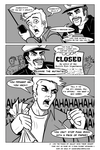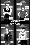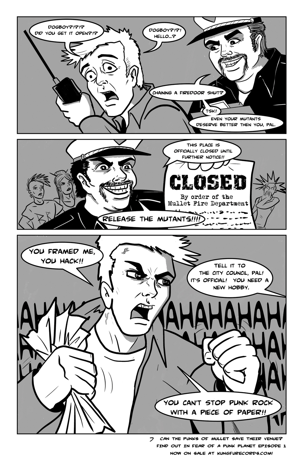 "Fear Of A Punk Planet is based on is based on the 7 episode Digital Entertainment Network series created by Joe Escalante back in 1998. Kung Fu Records actually has the first 3 episodes for sale on DVD and they are worth checking out for sure. However when Joe approached me about the possibility of working the story into a comic book, I immediately thought that the sarcastic banter that runs through the episodes would translate really well to comic book form. However, as much of a fan of comics that I am, this is my first attempt to really make one, and I learned a LOT. It's very different from creating a poster or album cover. Joe also kept pushing me to make the characters more cartoonish so no one would mistake the tone of the story for taking itself too serious. So the art style is my VERY feeble attempt to draw from the legendary Dan DeCarlo (Archie Comics) and maybe a bit of Jamie Hernandez (Love & Rockets) to match the tone of the material.