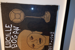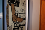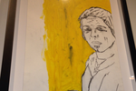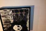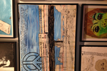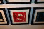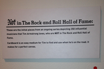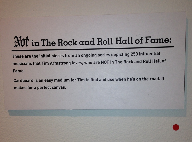 As I came to the final area of the exhibit I was greeted by a beverage stand to my left and some more artwork to my right. I chose not to quench my thirst just yet and wander through the hallway to explore the final stretch. In this final area the theme of all the artwork present was "Not in the Rock & Roll Hall of Fame." The pieces in question were the preliminary entries meant to span 250 artists that are influential to Tim. Perhaps what was most notable about the pieces of art in question was not so much the subject material but the vessels in which Tim used to create them. Each piece was made on cardboard while on tour, as cardboard is plentiful while on the road according to the description of the piece.