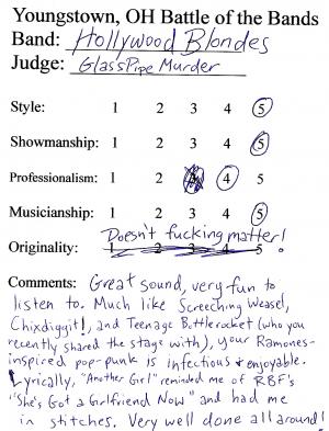 I apologize for the lack of words. I don't want to bore you with a description because you already know what Ramones-core sounds like. But here's the basics on the Hollywood Blondes' 15 Minutes of Lame EP: it's fast, snotty, catchy, fun, and most importantly, it's done very well. It's 15 minutes of some of the best pop-punk of this year. And if you want a better idea of what it sounds like, go to their MySpace page and listen for yourself!